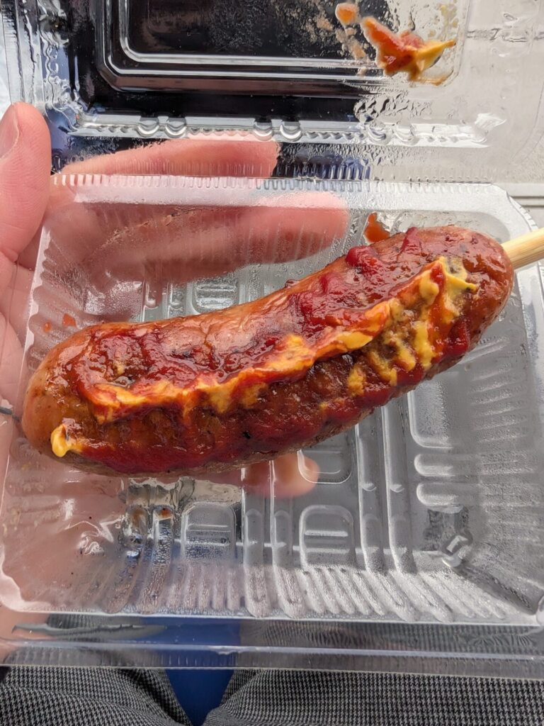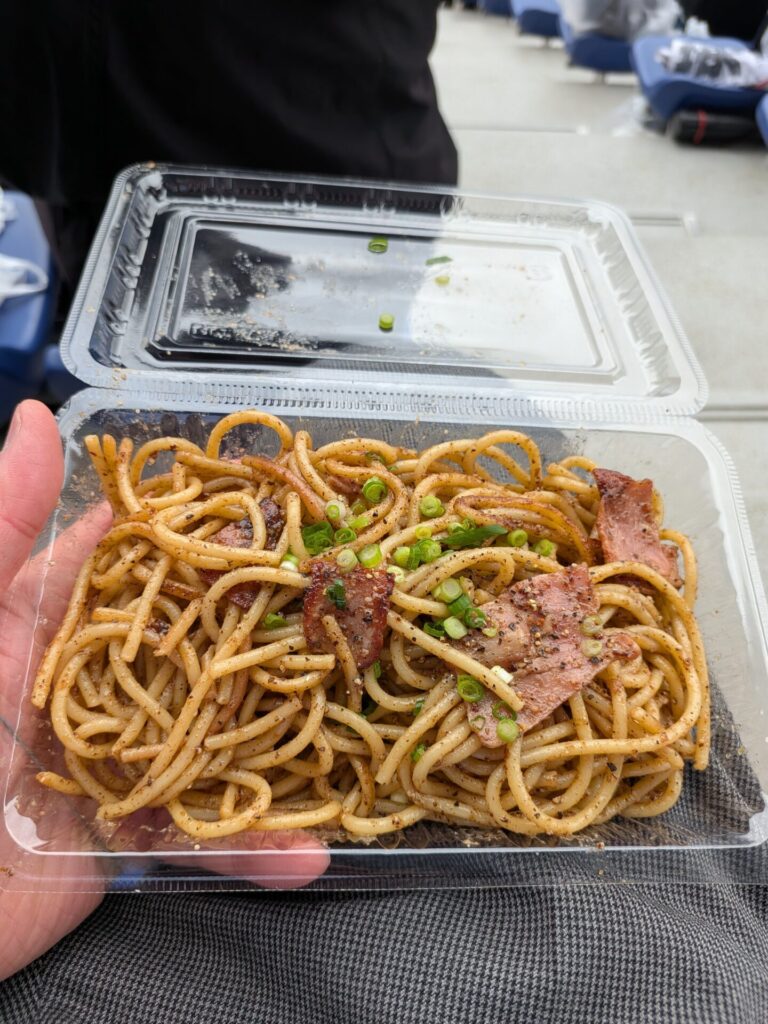 ということで素直にスタジアムグルメをいただきました。チキンボーと煮干し味焼きスパゲティとフランクフルト。焼きスパゲティは想像以上に煮干し感たっぷりでした。